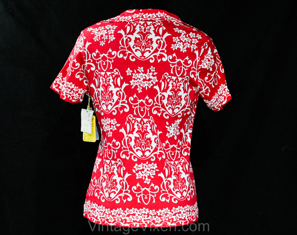 Size 8 Pink Flourishes Polo Shirt - 1960s Preppy Cotton Jersey Knit Top - Short Sleeve Shields Novelty Print - 60s NWT Deadstock - Bust 35.5
